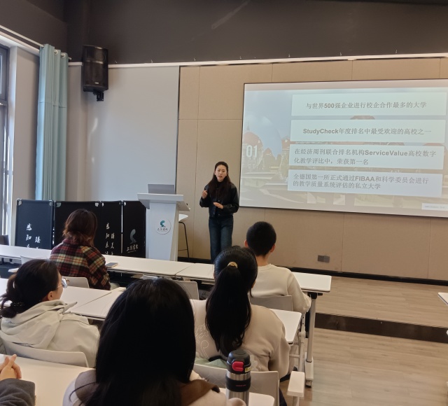 宣讲会伊始,张彩虹老师从“What”“Where”“Why”引入德国埃森经济管理应用技术大学,介绍了FOM留学项目的基本理念及本次活动的目的与意义,详细讲解了留学的申请条件、培养模式、教育特色、就业前景、竞争优势等关键信息,为同学们提供了全方面深层次的指导。